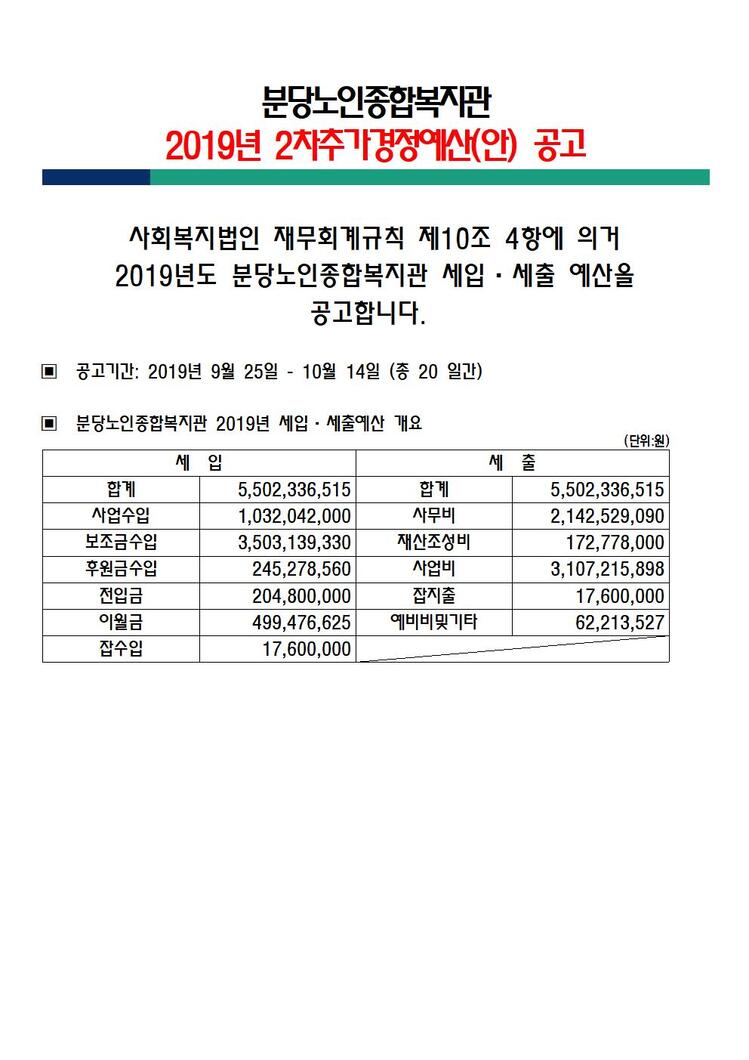 제목[재정공시]2019년도 분당노인종합복지관 2차 추가경정예산서(안) 세입,세출 예산 공고 카테고리 전체 작성자관리자 조회수1561작성일2019.09.24 첨부파일 2019년2차추경001.jpg