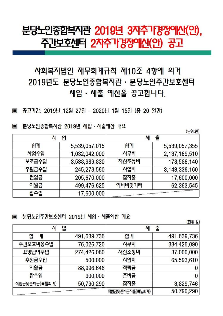 제목[재정공시] 2019년도 분당노인종합복지관 3차 추가경정예산서(안), 주간보호센터 2차추가경정예산(안) 세입,세출 예산 공고 카테고리 전체 작성자관리자 조회수1366작성일2019.12.27 첨부파일 2019년3차추경001001.jpg