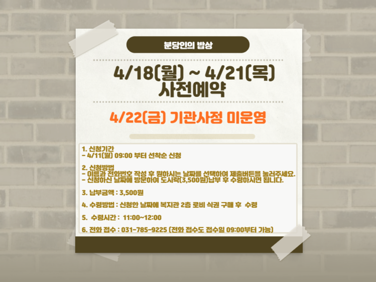 4/18(월)~4/21(목) 분당인의 밥상 사전예역(4/11(월) 09:00 접수)