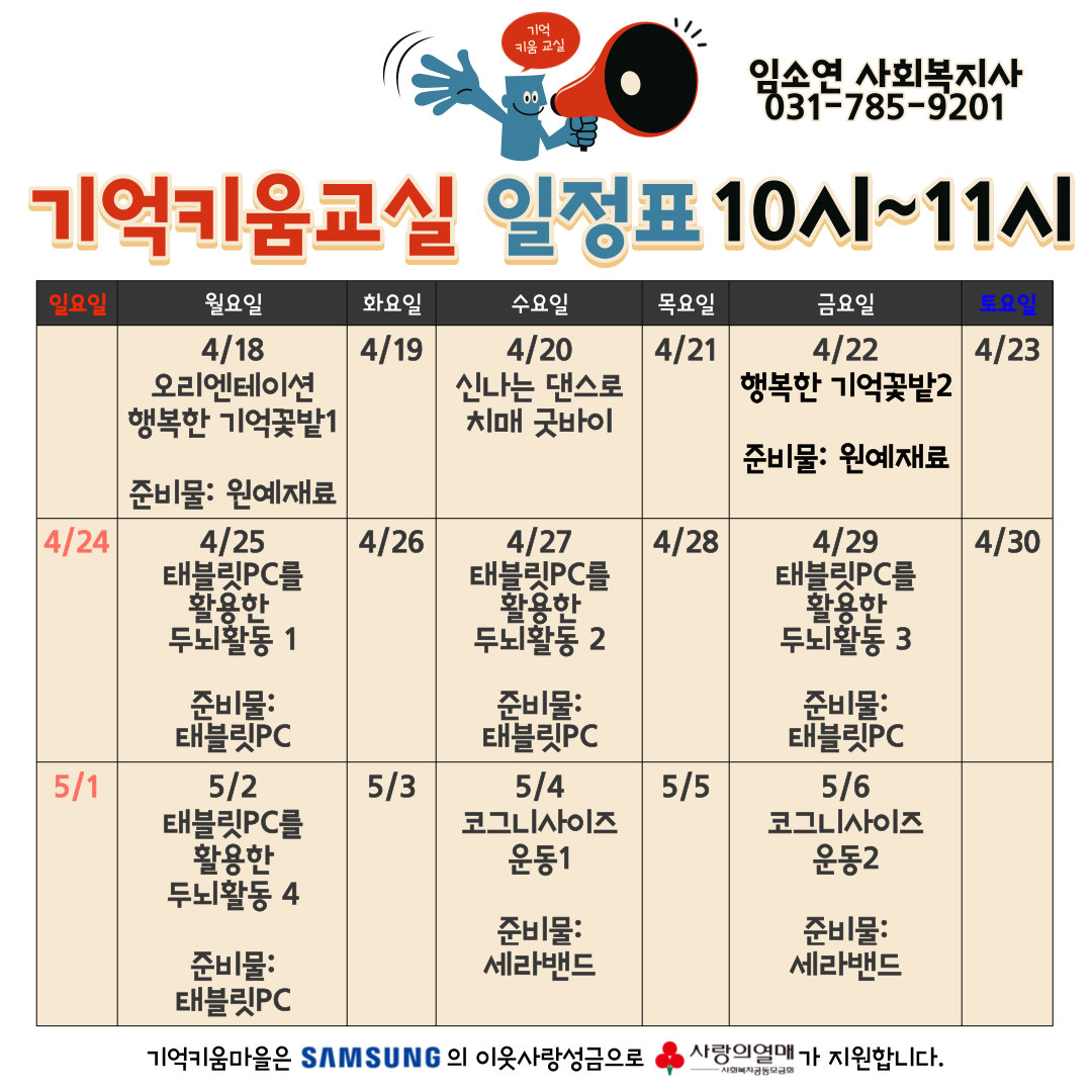또한, 수업 진행시 필요한 태블릿PC 대여를 위하여 4월 15일(금) 복지관 내방이 필요한 점 참고 부탁드립니다.