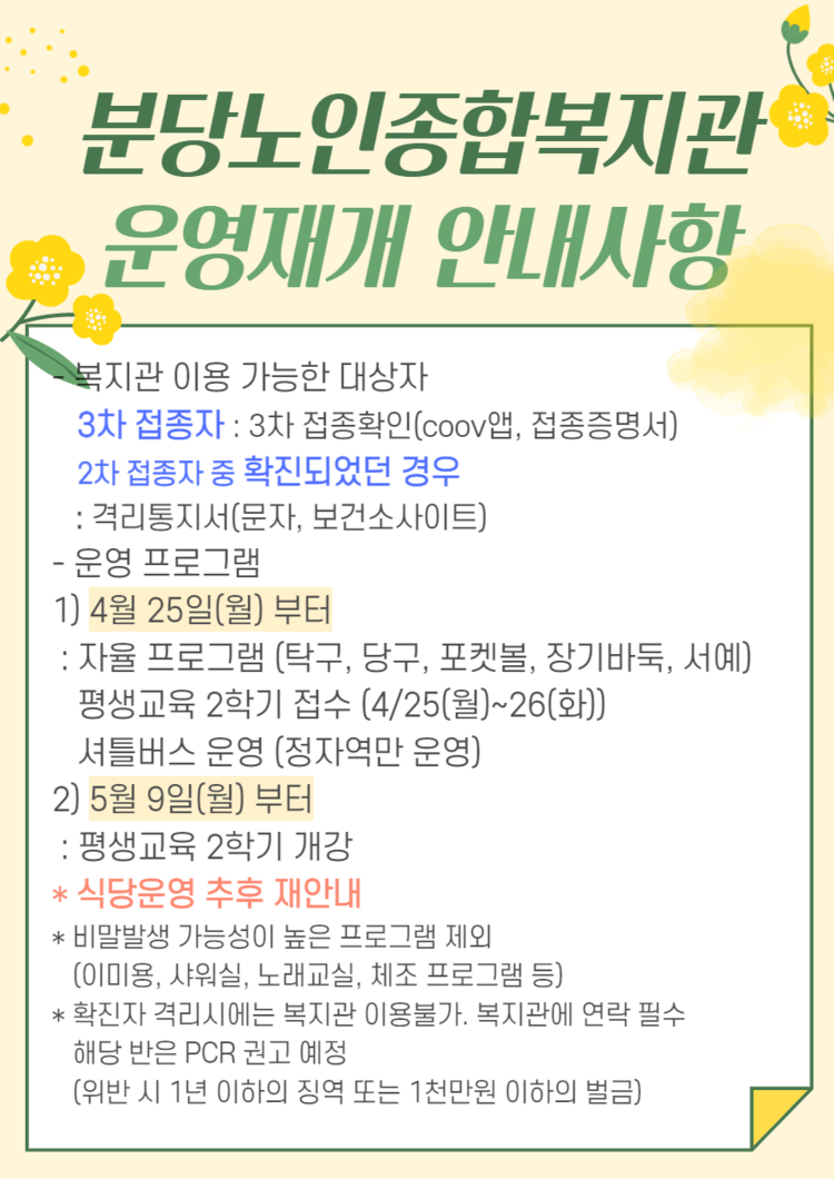 분당노인종합복지관 운영재개 안내사항