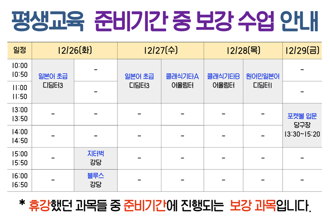 [평생교육] 준비기간 중 4학기 보강과목 안내