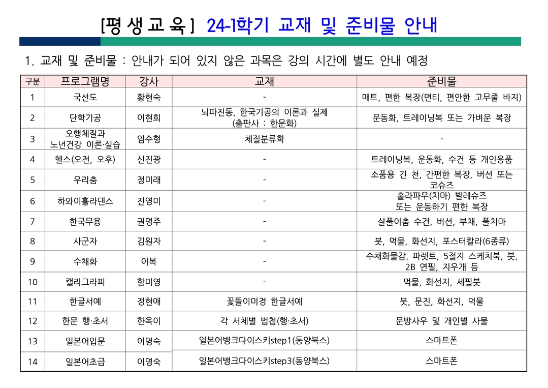 [평생교육] 24-1학기 교재 및 준비물 안내