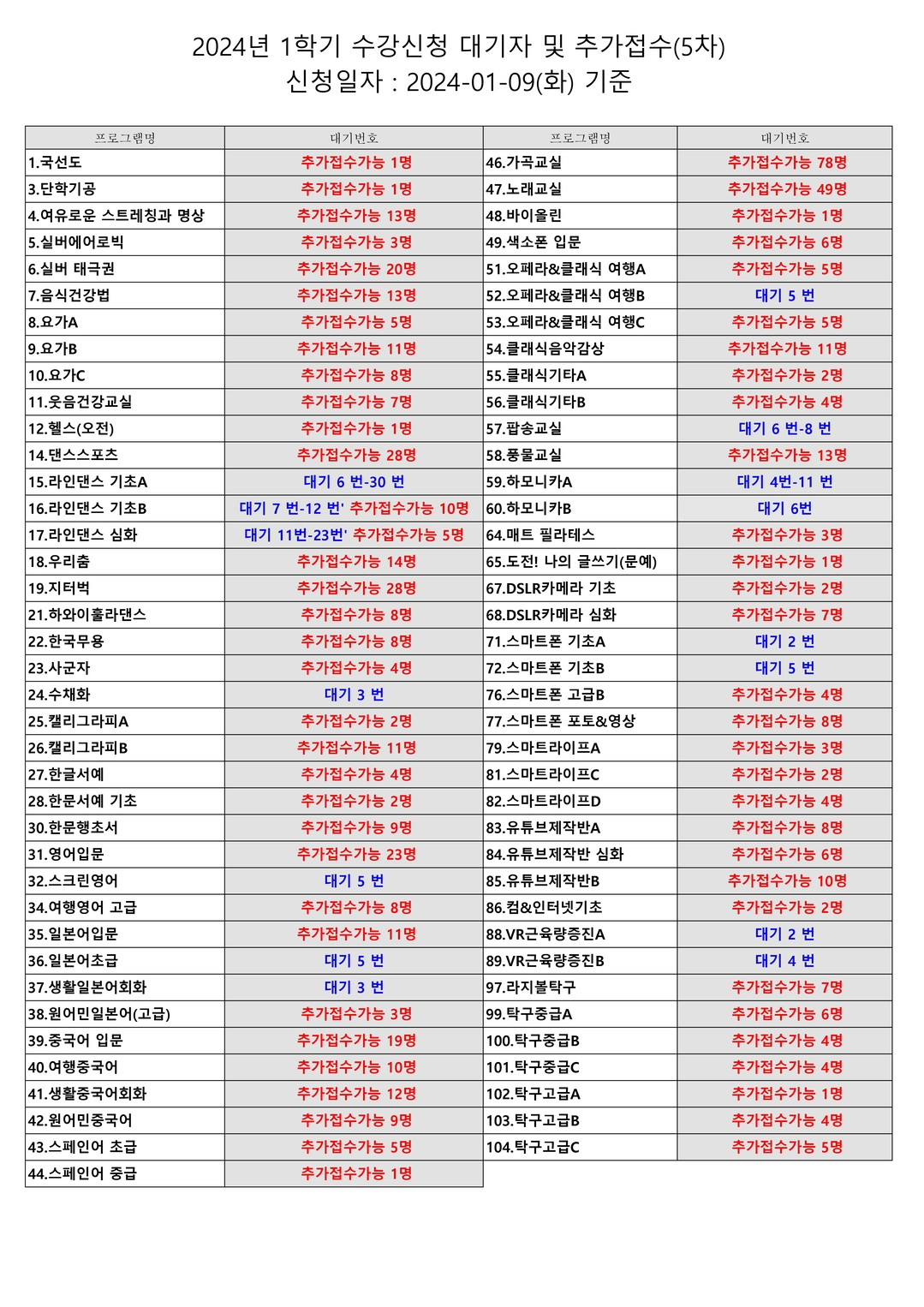 [평생교육] 24-1학기 5차 대기자 및 추가접수 가능과목