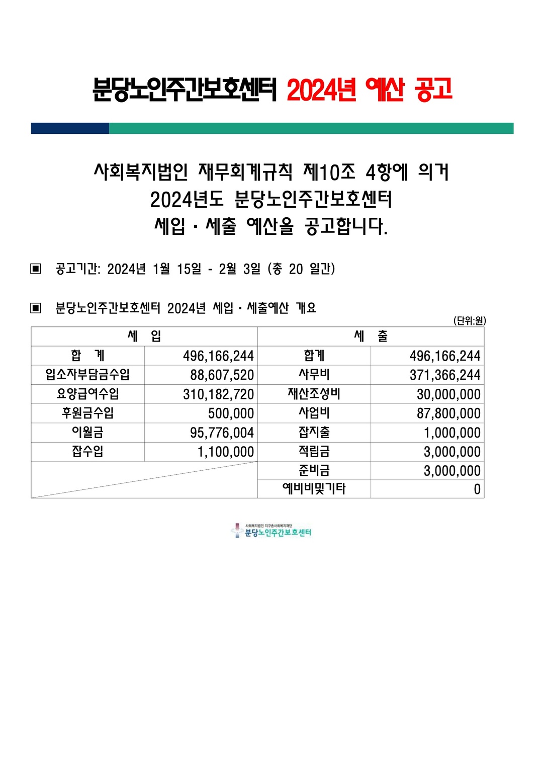 제목[재정공시] 2024년도 분당노인주간보호센터 세입,세출 예산 공고 카테고리 전체 작성자관리자 조회수564작성일2024.01.15 첨부파일 게시판 공고(2024 주간보호 예산).jpg