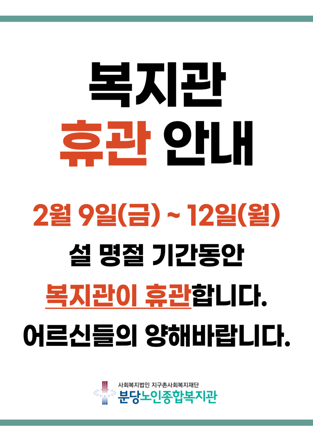 제목[휴관안내] 복지관 휴관안내(2월9일(금)~12일(월) 설명절 기간) 카테고리 전체 작성자관리자 조회수545작성일2024.02.06 첨부파일 휴관안내_2024-설명절_-001.png