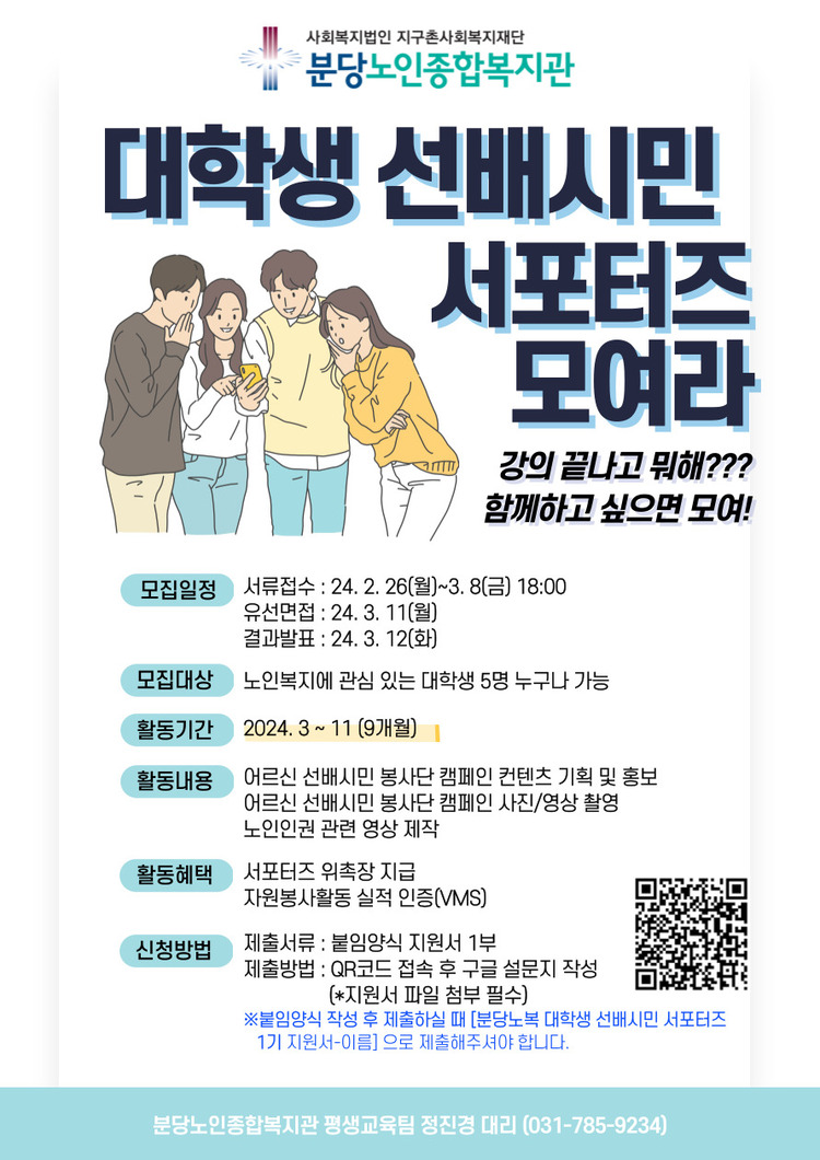 제목[분당노인종합복지관] 대학생 선배시민 서포터즈 1기 추가모집 카테고리 전체 작성자관리자 조회수780작성일2024.02.15 첨부파일 분당노복 대학생 선배시민 서포터즈 1기 지원서-OOO.hwp