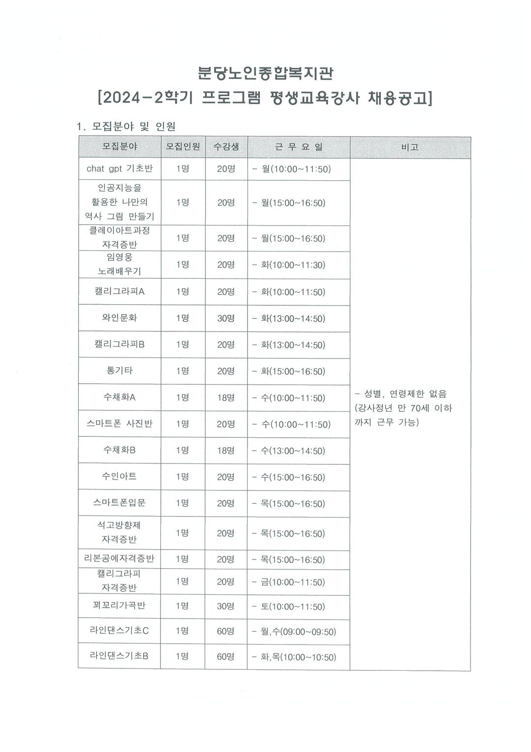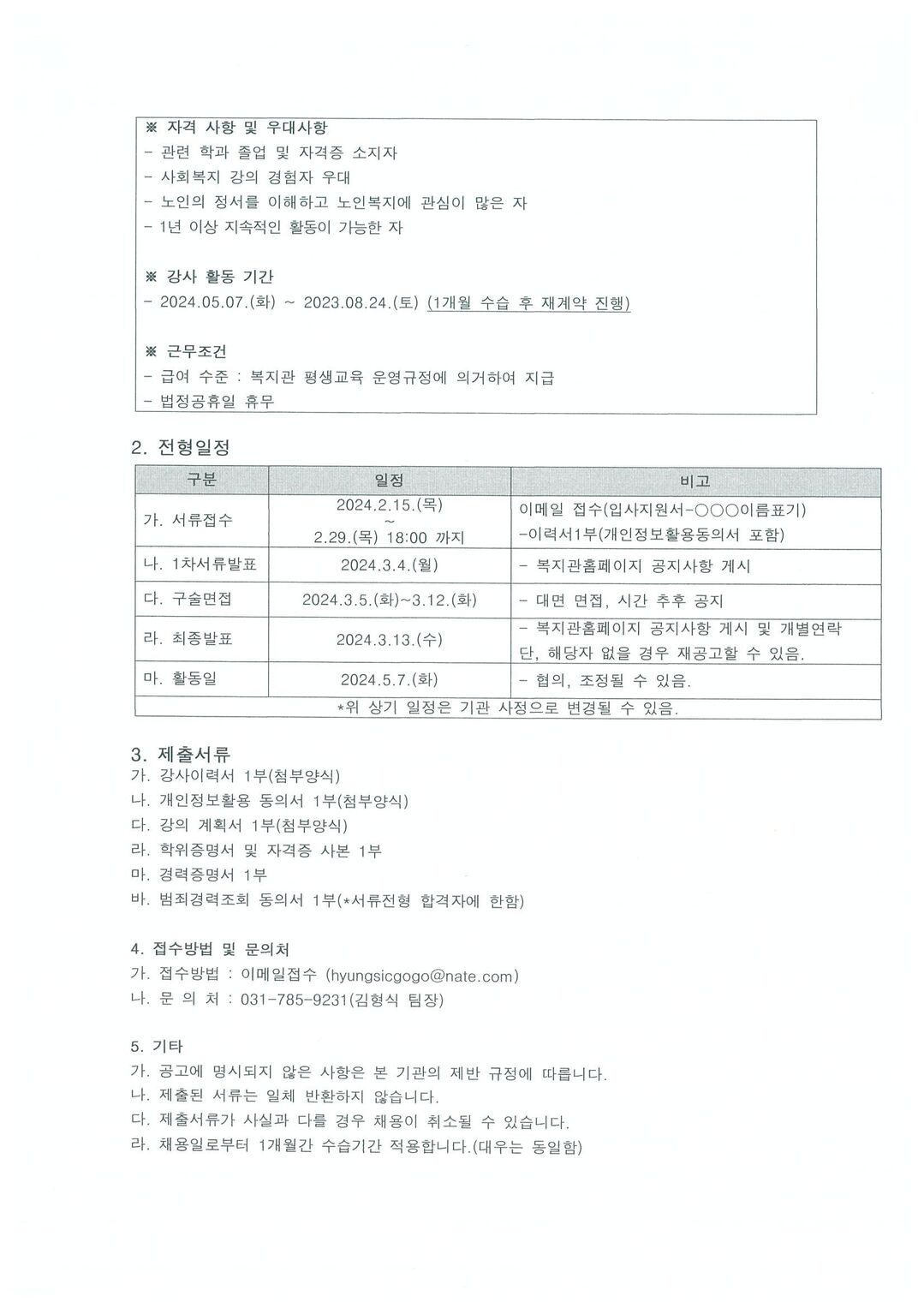 제목[평생교육] 2024-2학기 평생교육 프로그램 강사 채용 공고 카테고리 전체 작성자관리자 조회수1137작성일2024.02.15 첨부파일 2024-2학기 강사모집_공고문.hwp+2 qsJzsnbg=?= 정보수집동의서.hwp 강의_계획서(2024).hwp