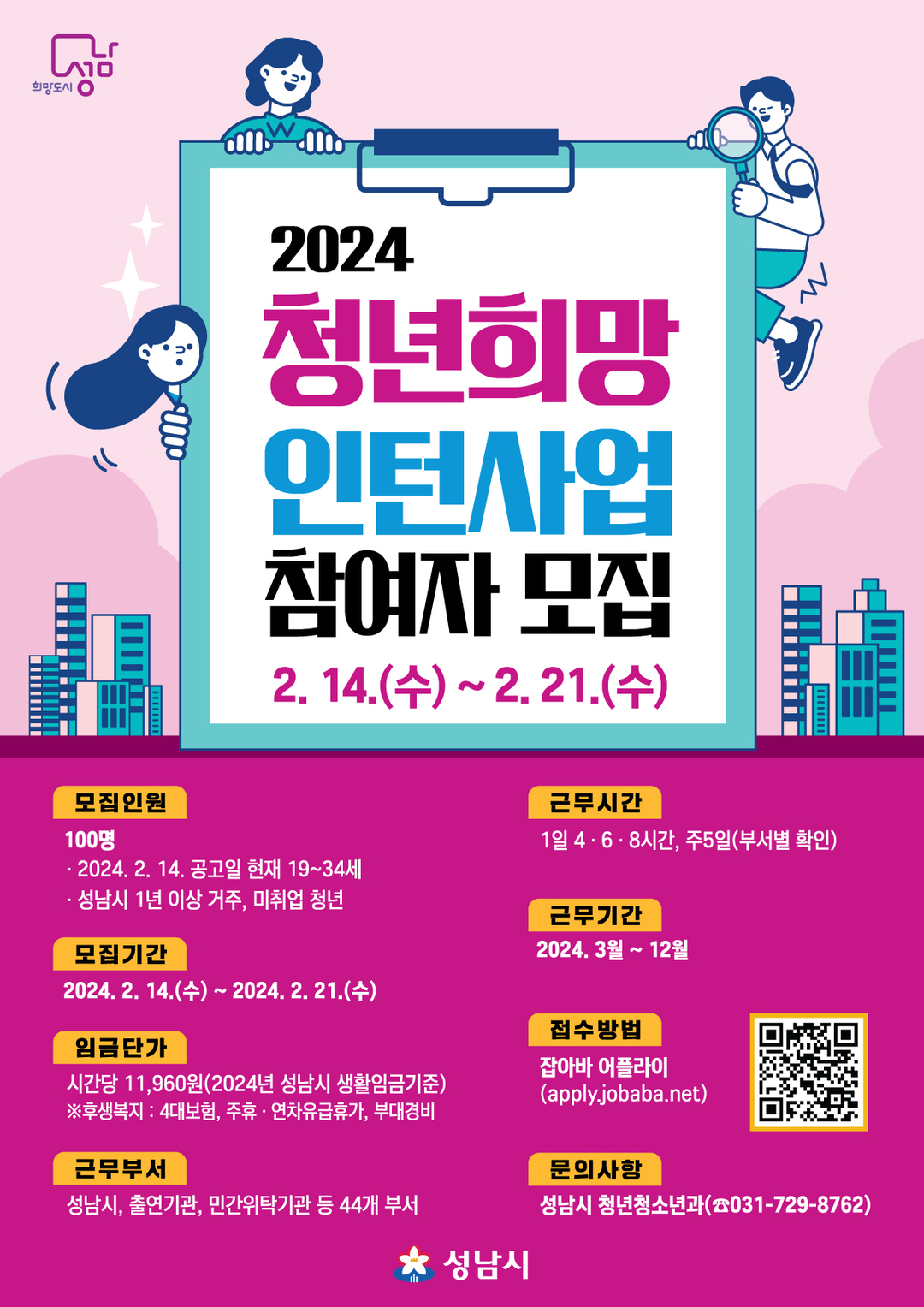 * 참여대상 : 성남시 1년이상 거주 미취업 청년(2024.2.14 공고일 현재 19~34세)