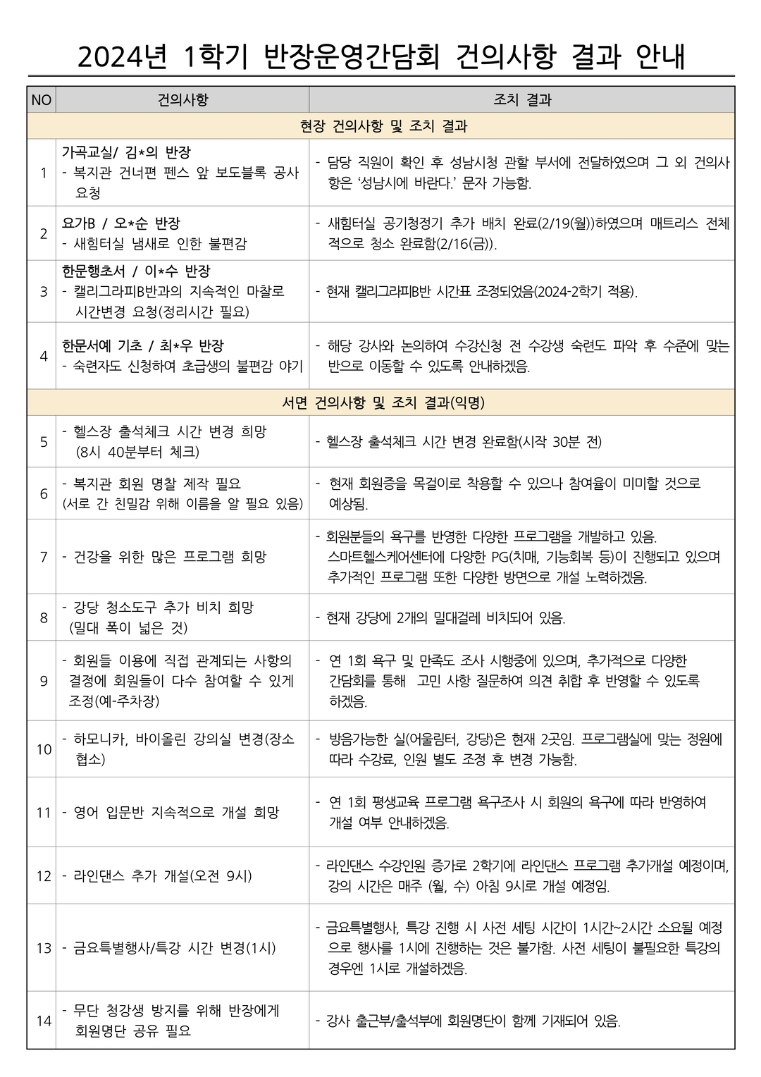[평생교육] 2024-1학기 반장 운영간담회 건의사항 및 조치 결과 안내
