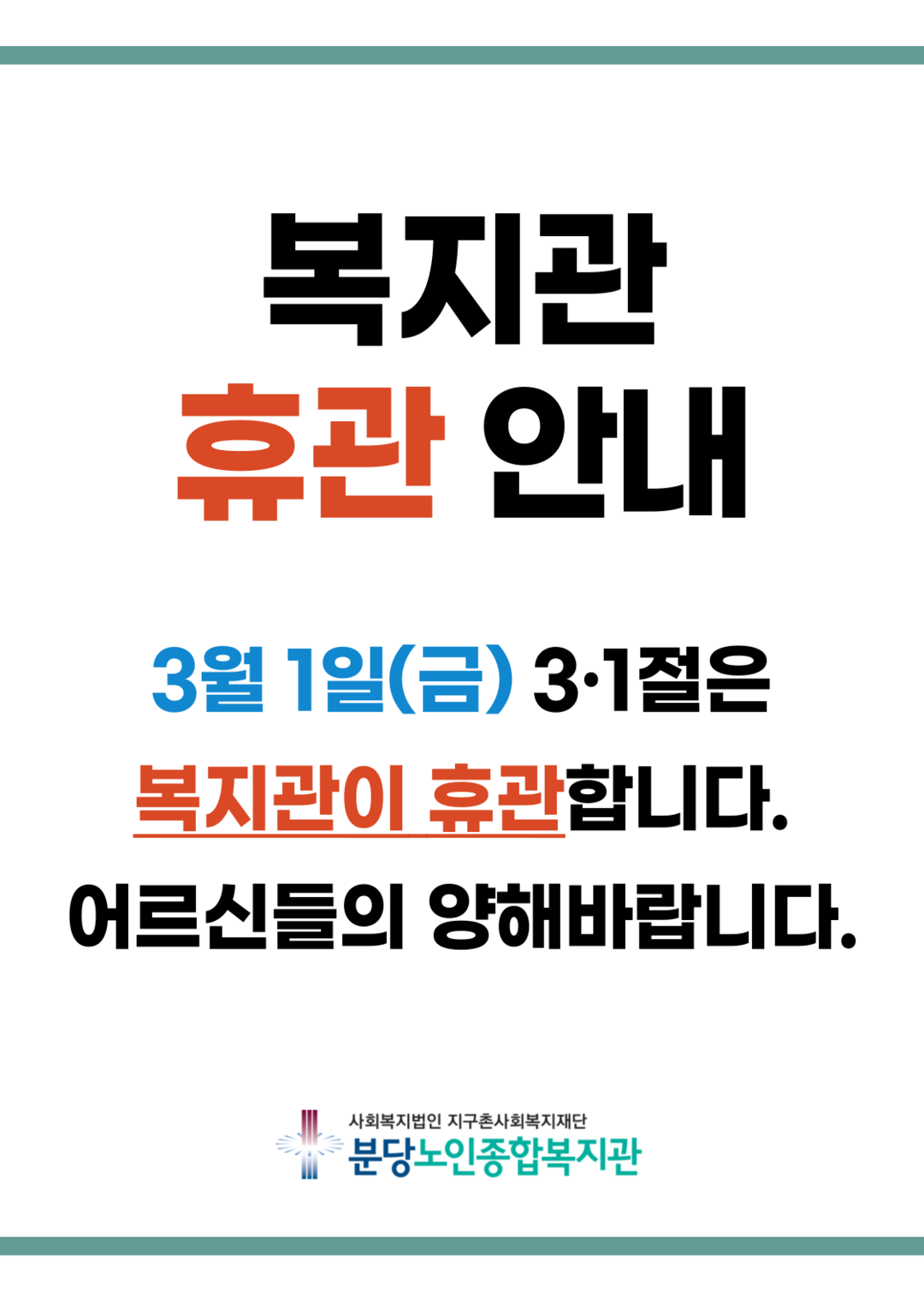 제목[휴관안내] 복지관 휴관안내(3/1(금) 3·1절) 카테고리 전체 작성자관리자 조회수453작성일2024.02.27 첨부파일 휴관안내_근로자의날_-어린이날___복사본-_1_.pdf