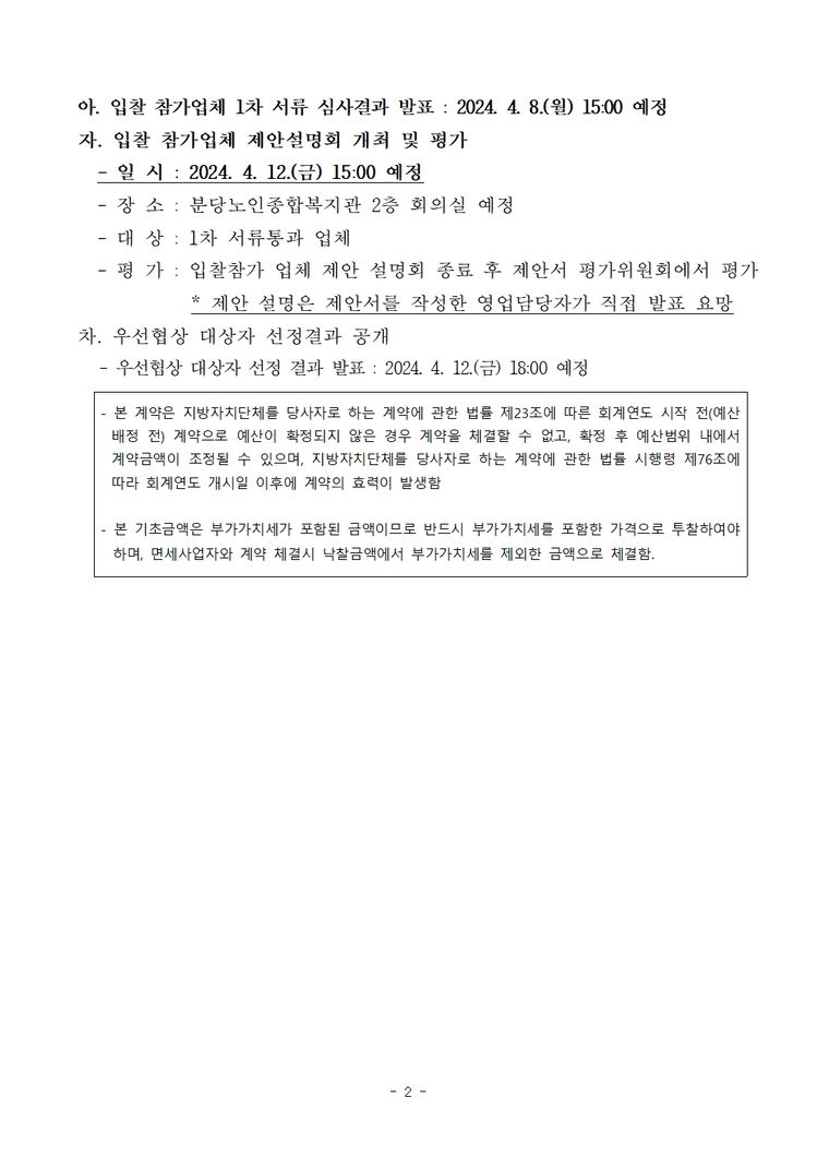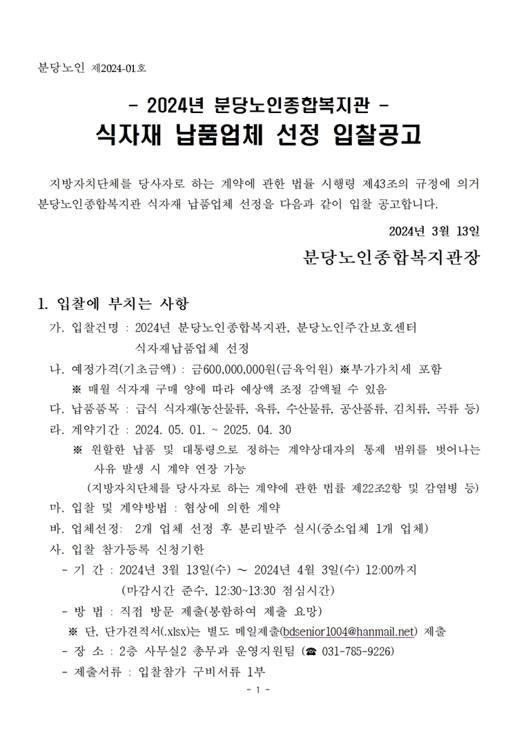 제목2024년 분당노인종합복지관 식자재 납품업체 선정 입찰공고 카테고리 전체 작성자관리자 조회수535작성일2024.03.13 첨부파일 2024년 식자재 납품업체 선정 입찰공고.hwp+2 2024년 식자재 납품업체 참가유의사항 및 제출서류.hwp 단가 견적서(양식 및 내용 변경 금지).xlsx