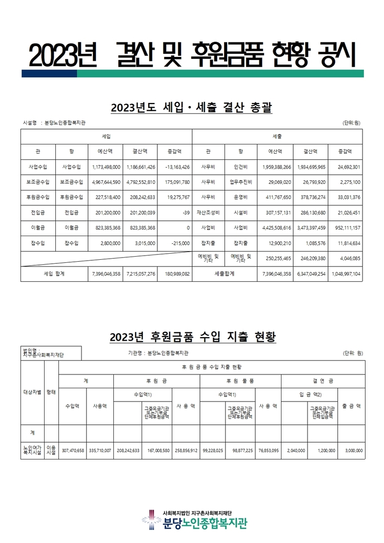 제목[재정공시] 2023년도 결산 및 후원금품 현황 공고(분당노인종합복지관) 카테고리 전체 작성자관리자 조회수605작성일2024.03.27 첨부파일 2023년 결산001.jpg+1 tmYjtjpjsnbTsp4Dsmqkp67aE64u564W47J24XzIwMg==?= 3 세입세출 결산보고서 등.xlsx