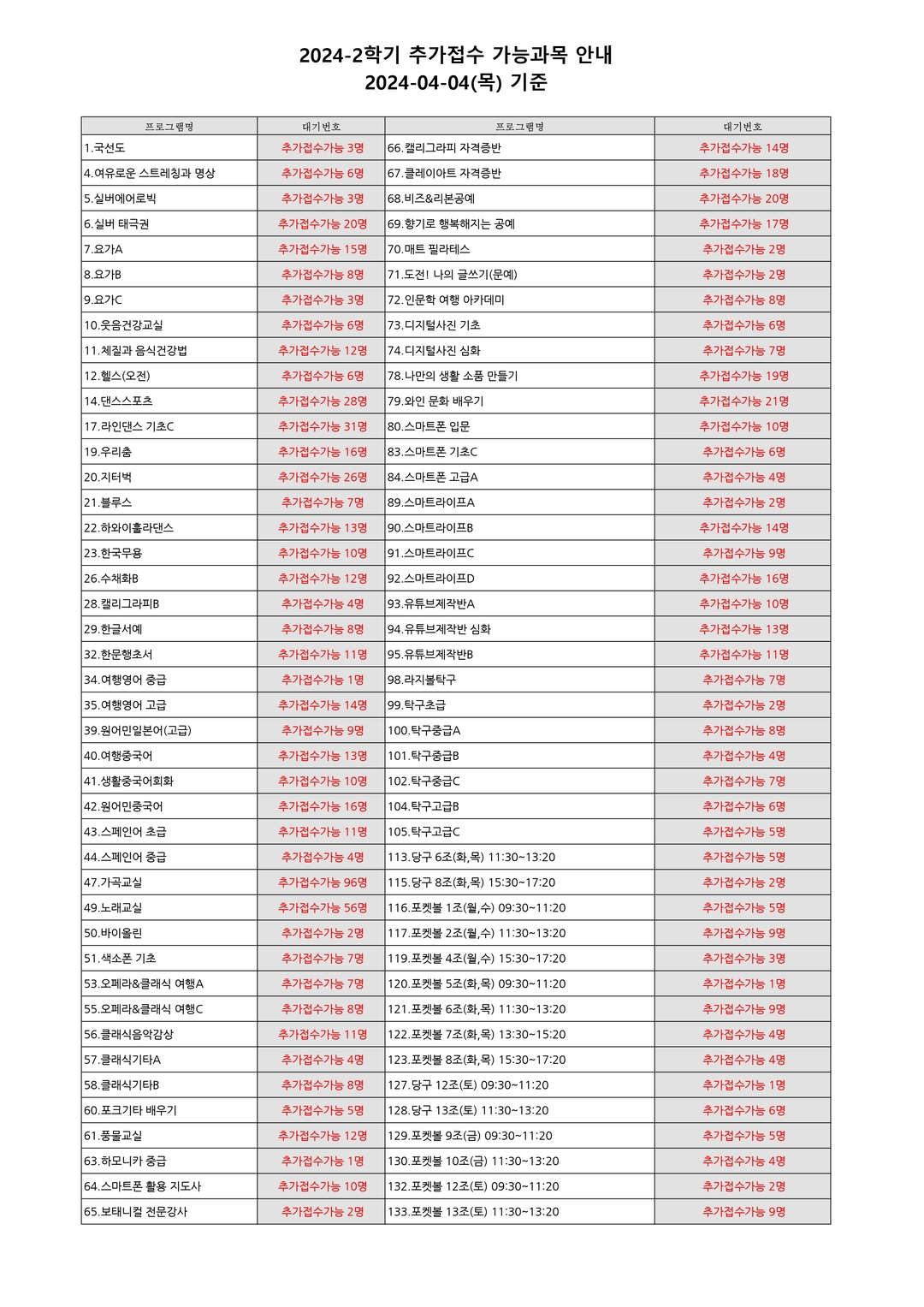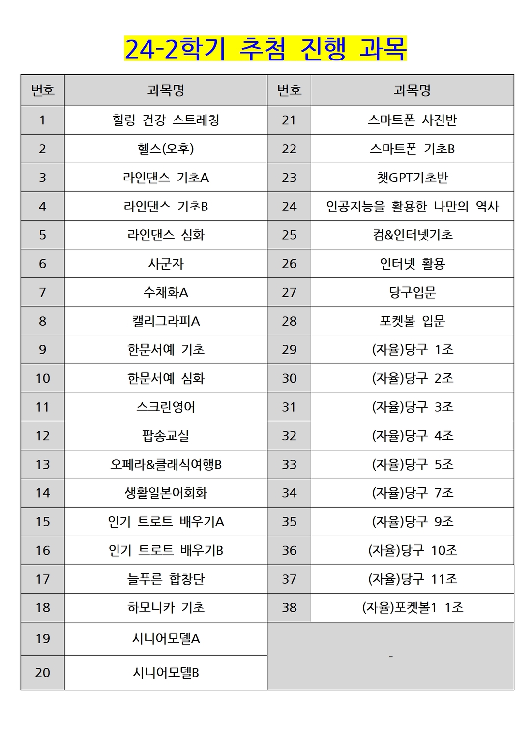 [평생교육] 2024-2학기 추첨진행 과목 및 추가접수 과목 안내