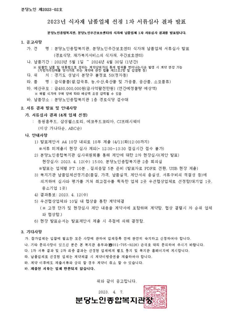 제목2023년 식자재 납품업체 선정 1차 서류심사 결과 발표 카테고리 전체 작성자관리자 조회수426작성일2023.04.07 첨부파일 2023년 식자재 납품업체 선정 1차 서류심사 결과 발표.jpg