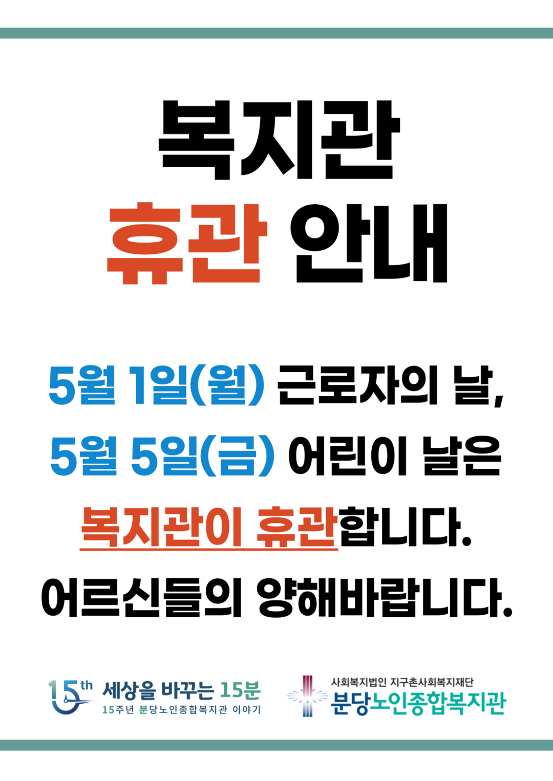 제목복지관 휴관안내(5/1(월) 근로자의날, 5/5(금) 어린이날) 카테고리 전체 작성자관리자 조회수434작성일2023.04.26 첨부파일 휴관안내_근로자의날_-어린이날__-001.png